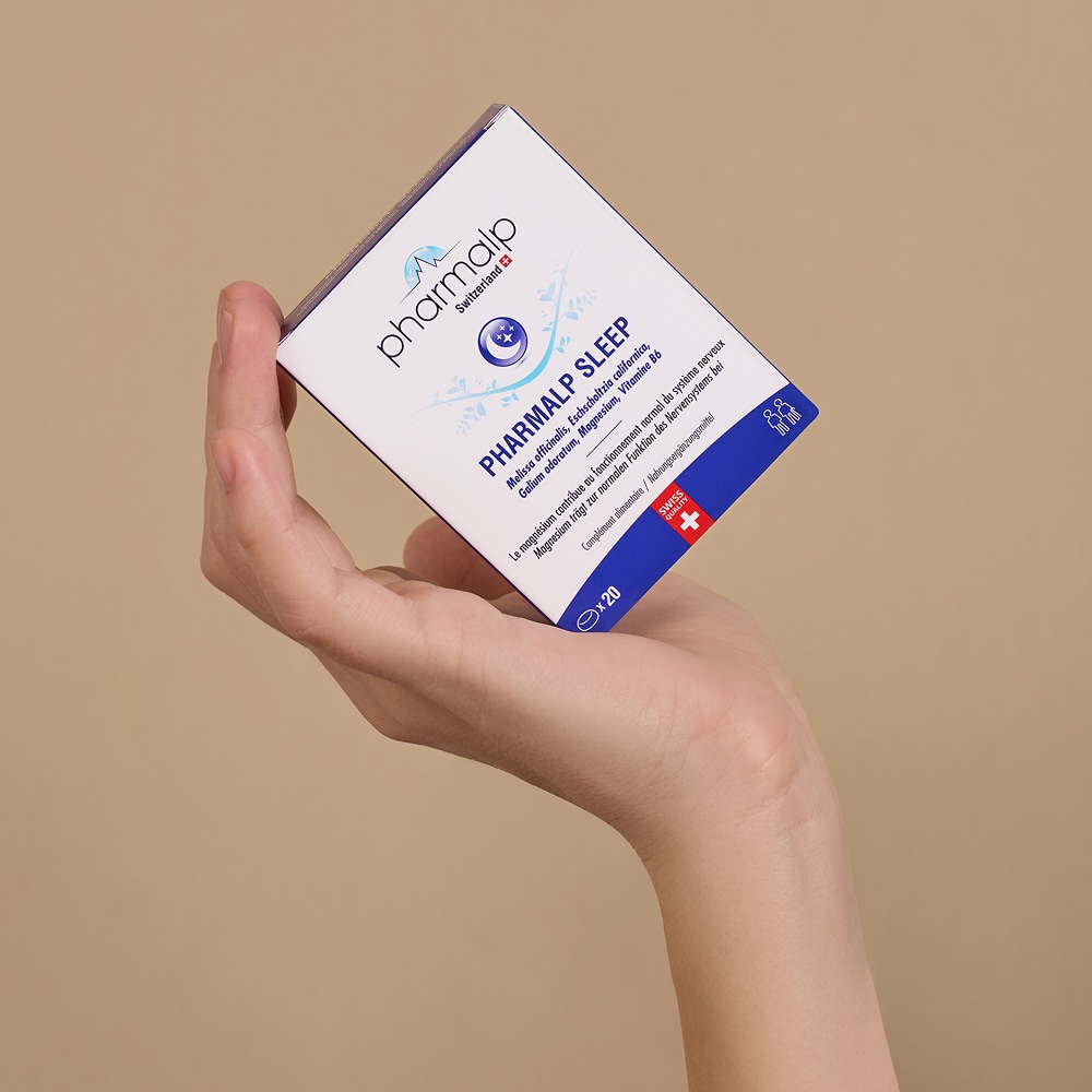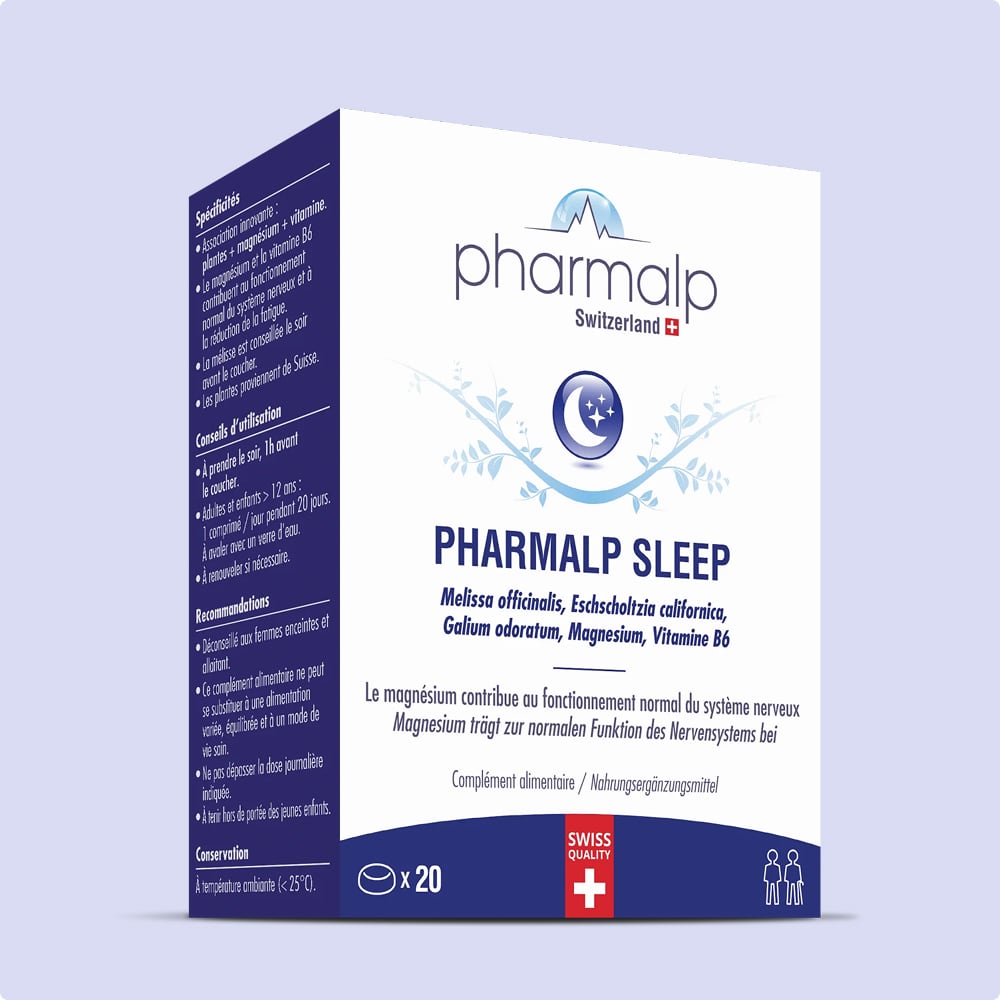 PHARMALP SLEEP, à base de Mélisse + Eschscholtzia (Pavot de Californie) + Aspérule odorante + Magnésium + Vitamine B6, est un complément alimentaire à prendre avant de se coucher pour aider l’organisme à se détendre et se reposer*